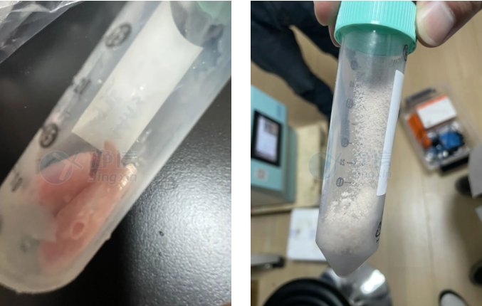 上圖為1分鐘的研磨效果,已經(jīng)完全研磨完成。效果非常好,冷凍研磨儀一次可以研磨2個(gè)樣品,大大提高了之前用手磨的效率和效果,所以人工研磨特別不方便,經(jīng)過(guò)多次了解和對(duì)比所以老師選用凈信冷凍研磨儀代替人工處理。效率高,效果好。解決了老師的研磨問(wèn)題。